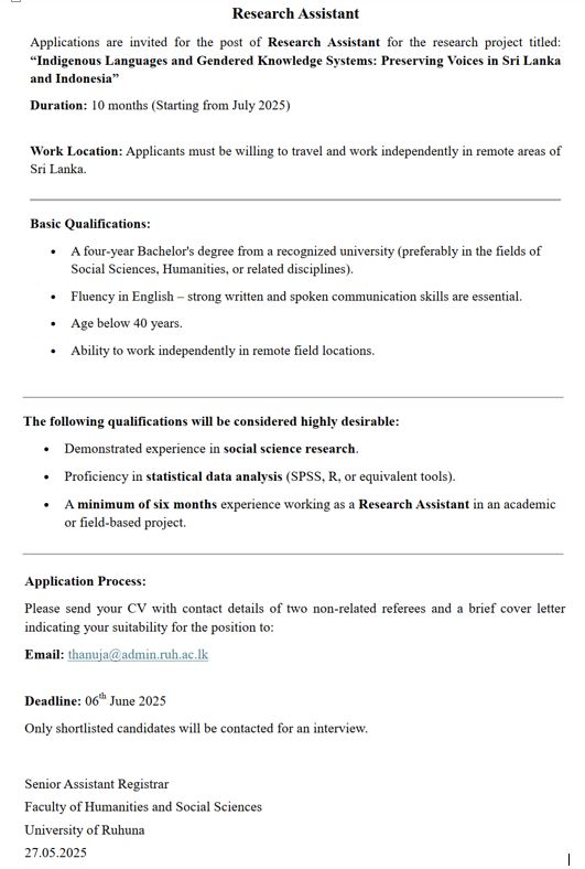 Note: It is the policy to appoint only the Graduate Research Assistants who willing to register for a M.Phil at University of Ruhuna)