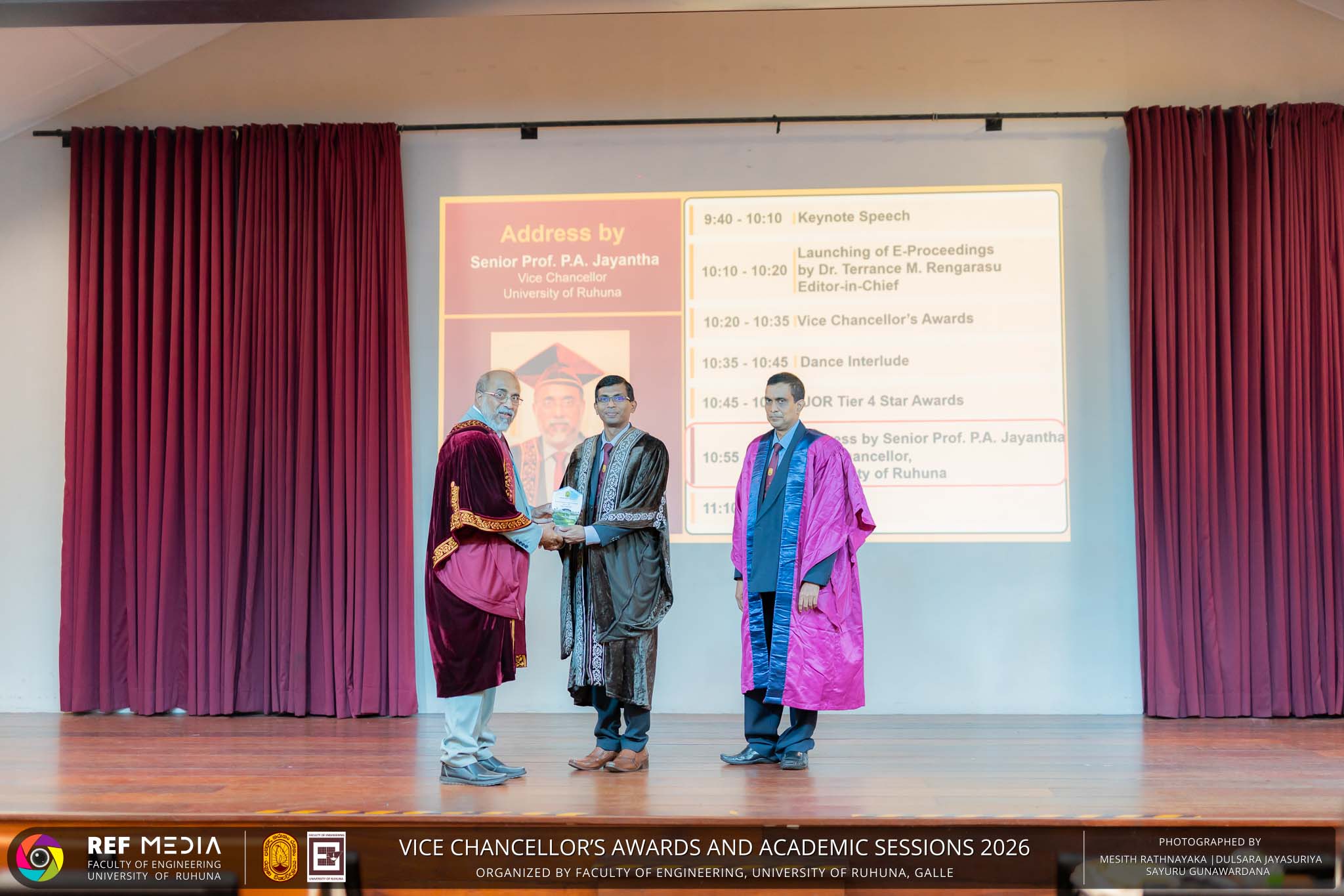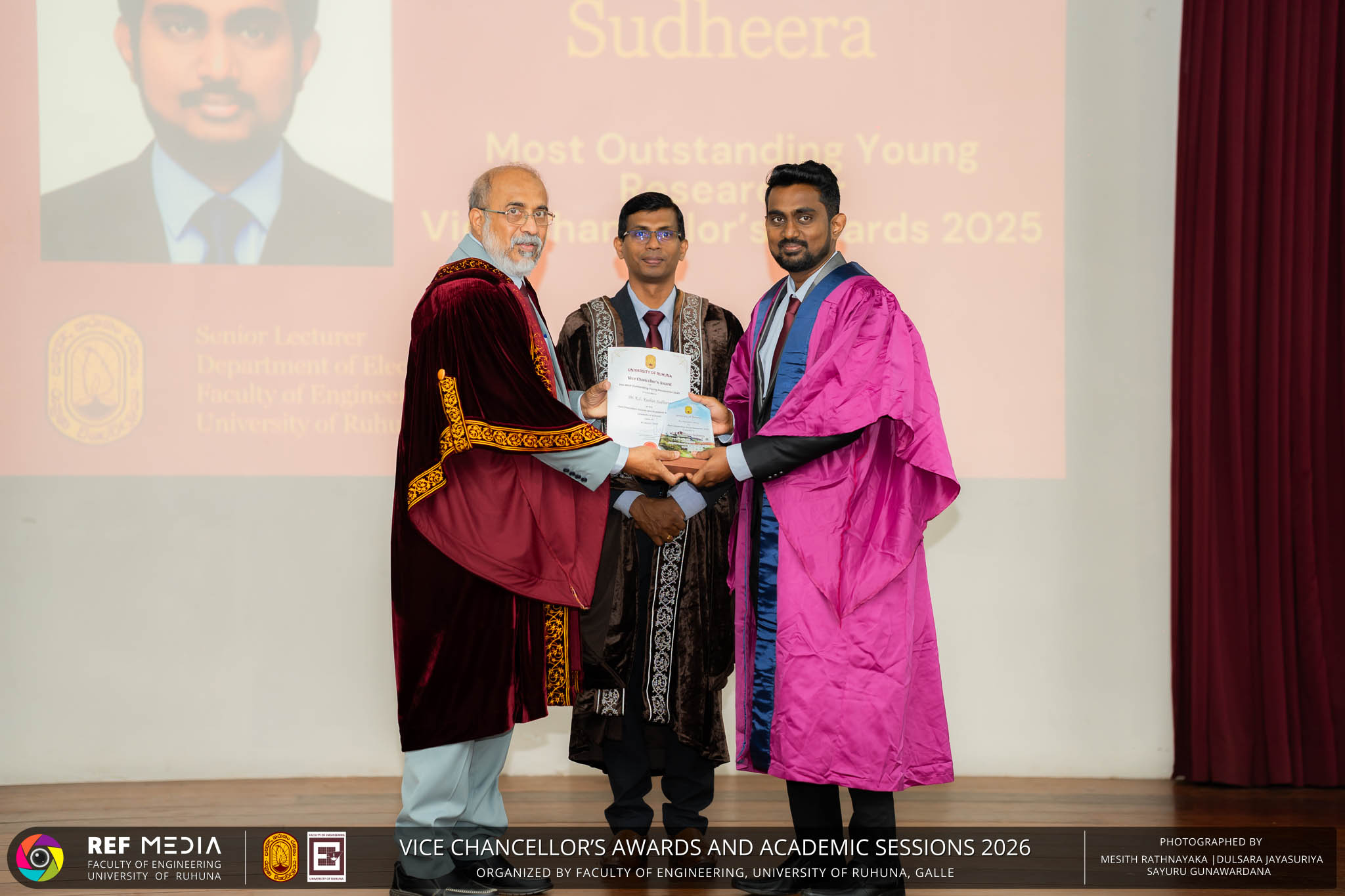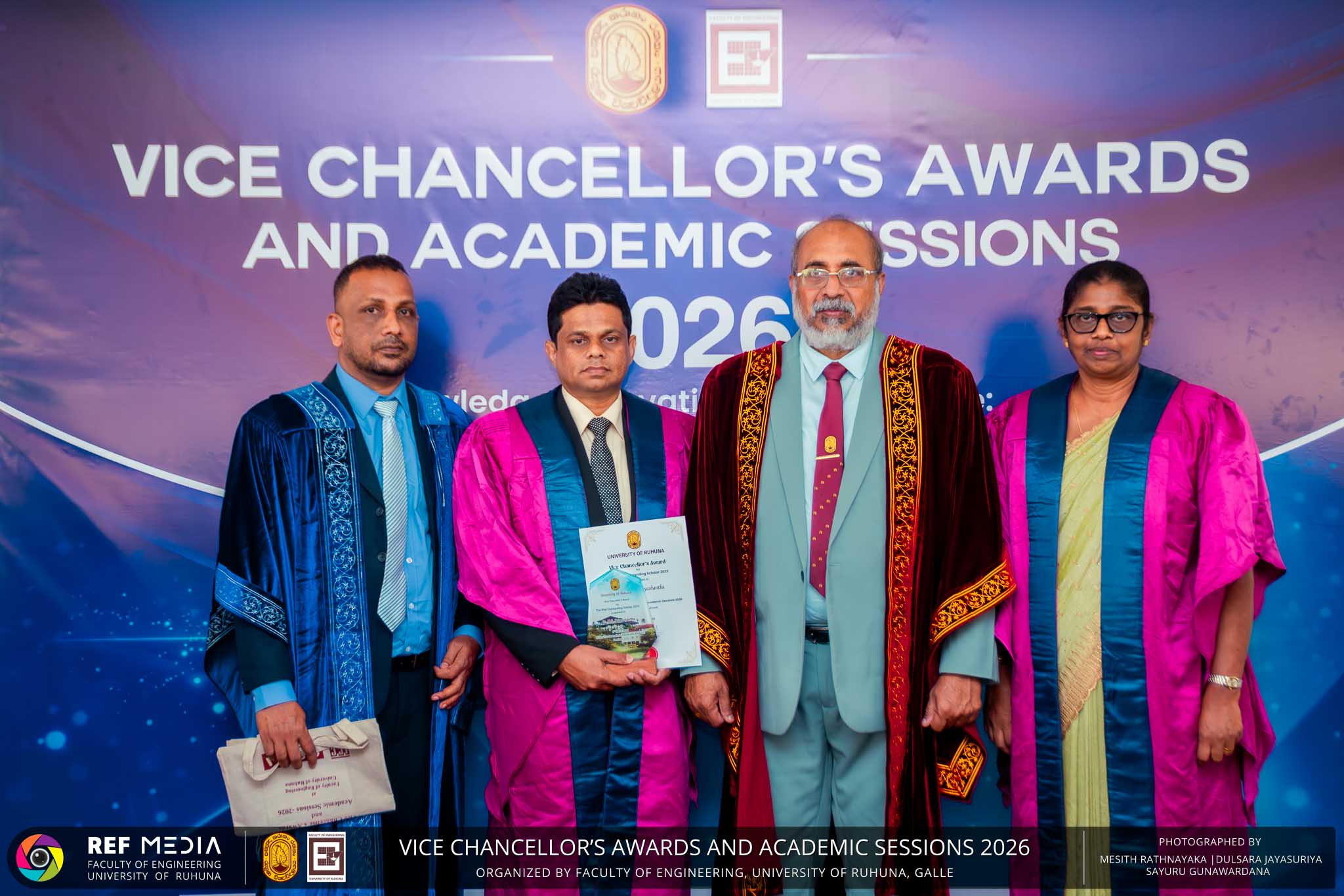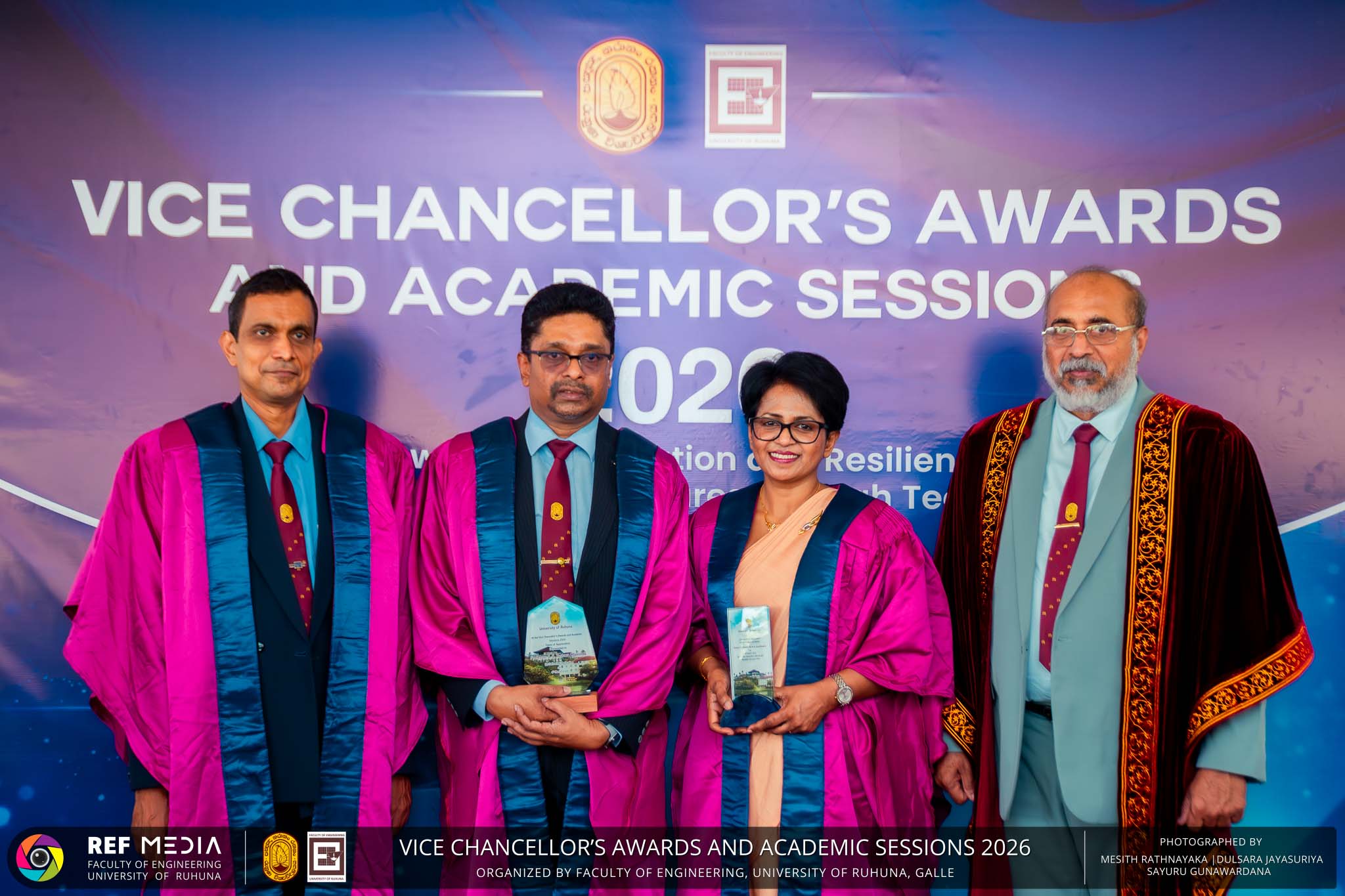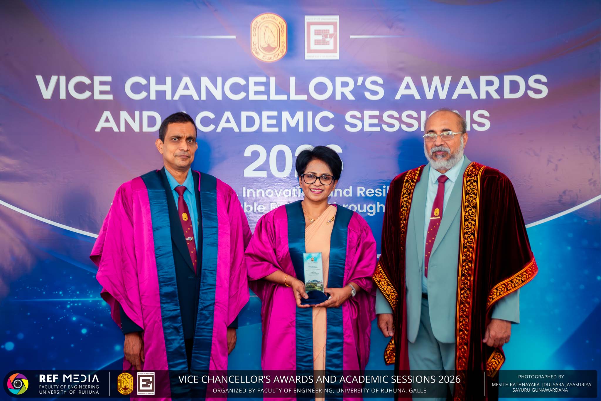 The Vice Chancellor’s Awards and Academic Sessions 2026 of the University of Ruhuna was successfully held on 4th March 2026 at the Faculty of Engineering, Hapugala, Galle, under the theme “Knowledge, Innovation, and Resilience: Towards Sustainable Futures through Technology”. The event served as an important platform for recognizing academic excellence, research achievements, and scholarly contributions across the University. The occasion was graced by Senior Professor P. A. Jayantha, Vice Chancellor of the University of Ruhuna, whose presence highlighted the significance of celebrating research excellence and academic accomplishments within the university community. The keynote address, titled “Research in the Era of AI and Advanced Technologies,” was delivered by Senior Professor Ruwan Gopura from the Faculty of Engineering, University of Moratuwa. The keynote provided valuable insights into emerging research directions and the impact of advanced technologies and artificial intelligence on contemporary research. A significant highlight of the occasion was the conferment of the Emeritus Professorship on Senior Professor (Ms.) K. A. P. W. Jayatilaka from the Faculty of Medicine, recognizing her distinguished academic service and contributions to the University. The Oration was delivered by Professor G. G. Tushara Chaminda on the topic “The Contribution of Pharmaceutical Pollutants in Sri Lankan Waters to Antibiotic Resistance.” The presentation highlighted the environmental presence of pharmaceutical residues in water bodies and their potential role in promoting antibiotic-resistant microorganisms. The Oration emphasized the importance of effective waste management, environmental monitoring, and research to address this emerging public health concern. It also drew attention to the relevance of this issue within the Sri Lankan context. During the event, Best Presenter Awards were presented to the recipients of the Academic Sessions 2025, covering both technical sessions and poster presentations in recognition of their outstanding research presentations. A highlight of the event was the presentation of the Vice Chancellor’s Awards, which recognize outstanding academic achievements within the University. Dr. K. G. Priyashantha from the Faculty of Management and Finance was honored as the Most Outstanding Scholar of the University, while Dr. K. L. Kushan Sudheera from the Faculty of Engineering received the award for the Most Outstanding Young Researcher. Furthermore, Professor Anoja P. Attanayaka from the Faculty of Medicine was recognized as the Most Outstanding Staff Inventor/Innovator. In recognition of exceptional research performance, the UOR Tier 4 Star Award was presented to Senior Professor Ajith Nagahawatta from the Faculty of Medicine and Senior Professor D. A. L. Leelamanie from the Faculty of Agriculture. The Academic Sessions provided a platform for researchers, academic staff, and postgraduate students to present their research findings through technical and poster sessions covering a wide range of disciplines. The event facilitated knowledge sharing, interdisciplinary engagement, and the dissemination of new research findings within the university community. A total of 123 abstracts were accepted for presentation, while 05 submissions were desk rejected and 07 abstracts were withdrawn due to unavoidable reasons (refer to Tables 1 and 3). Faculty-wise submissions (refer to Table 2) indicated that the Faculty of Engineering contributed the highest proportion (39%), followed by the Faculty of Agriculture (16%), the Faculty of Technology (14%), and the Faculty of Allied Health Sciences (13%). Other faculties of the University also contributed to the academic sessions. In total, 10 technical sessions and 3 poster sessions were conducted under seven thematic areas, showcasing research presented by university staff as well as postgraduate and undergraduate students. The event programme also included two cultural dance performances presented by undergraduate students of the Faculty of Engineering, which added a vibrant cultural element to the proceedings. The programme was smoothly conducted with the support of a dedicated team of Masters of Ceremonies. The event attracted more than 400 participants, reflecting strong engagement from the university community. The event was organized under the leadership of Professor Sudhira De Silva, Chair of the Organizing Committee, with Dr. Kumudu Seneviratna serving as the Secretary. The successful conduct of the event was made possible through the collective efforts and support of academic, administrative, non-academic staff and students who contributed to its organization. Overall, the Vice Chancellor’s Awards and Academic Sessions – 2026 strengthened the research culture of the University of Ruhuna by recognizing scholarly excellence and providing a platform for academic engagement and collaboration.