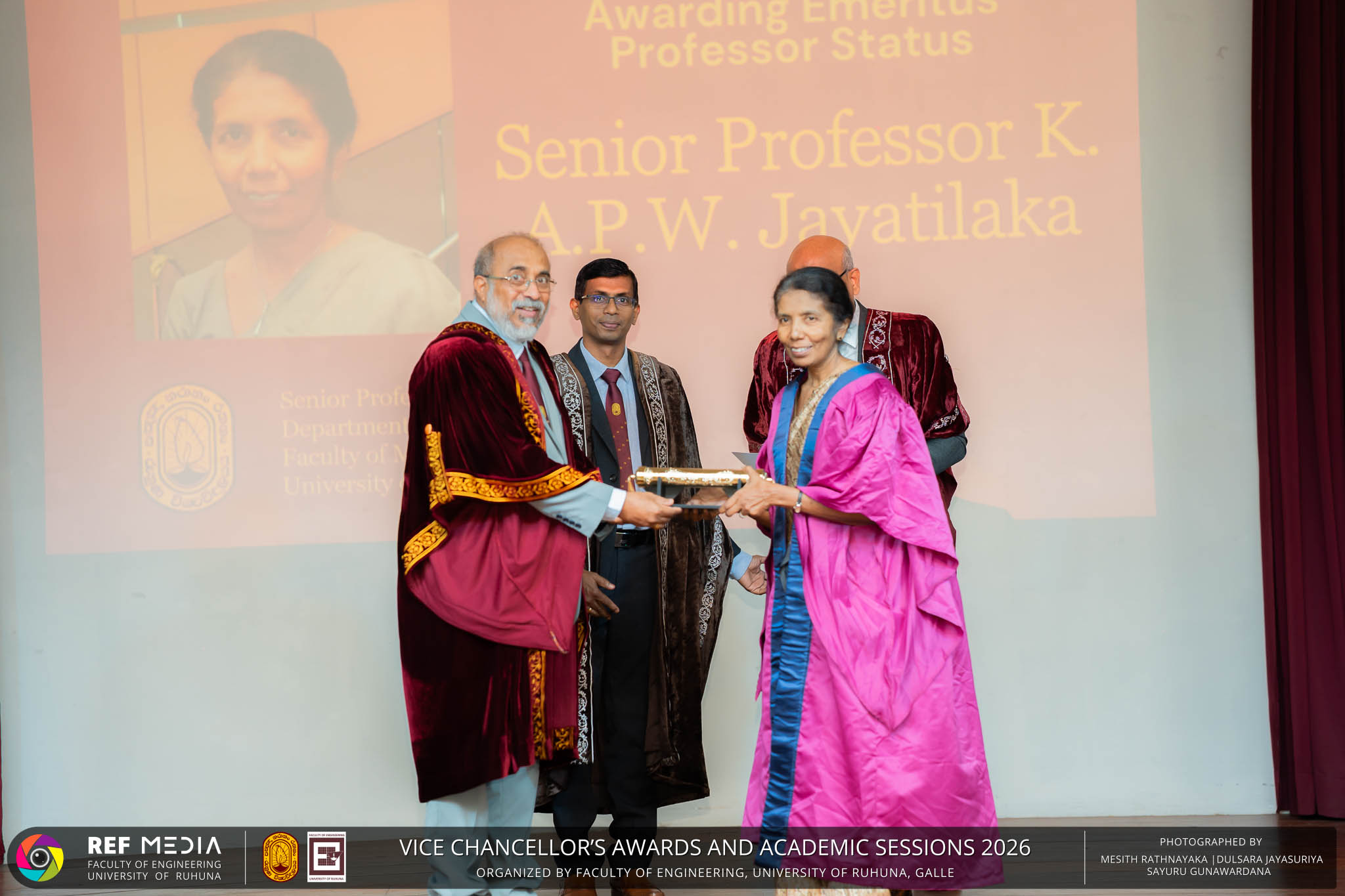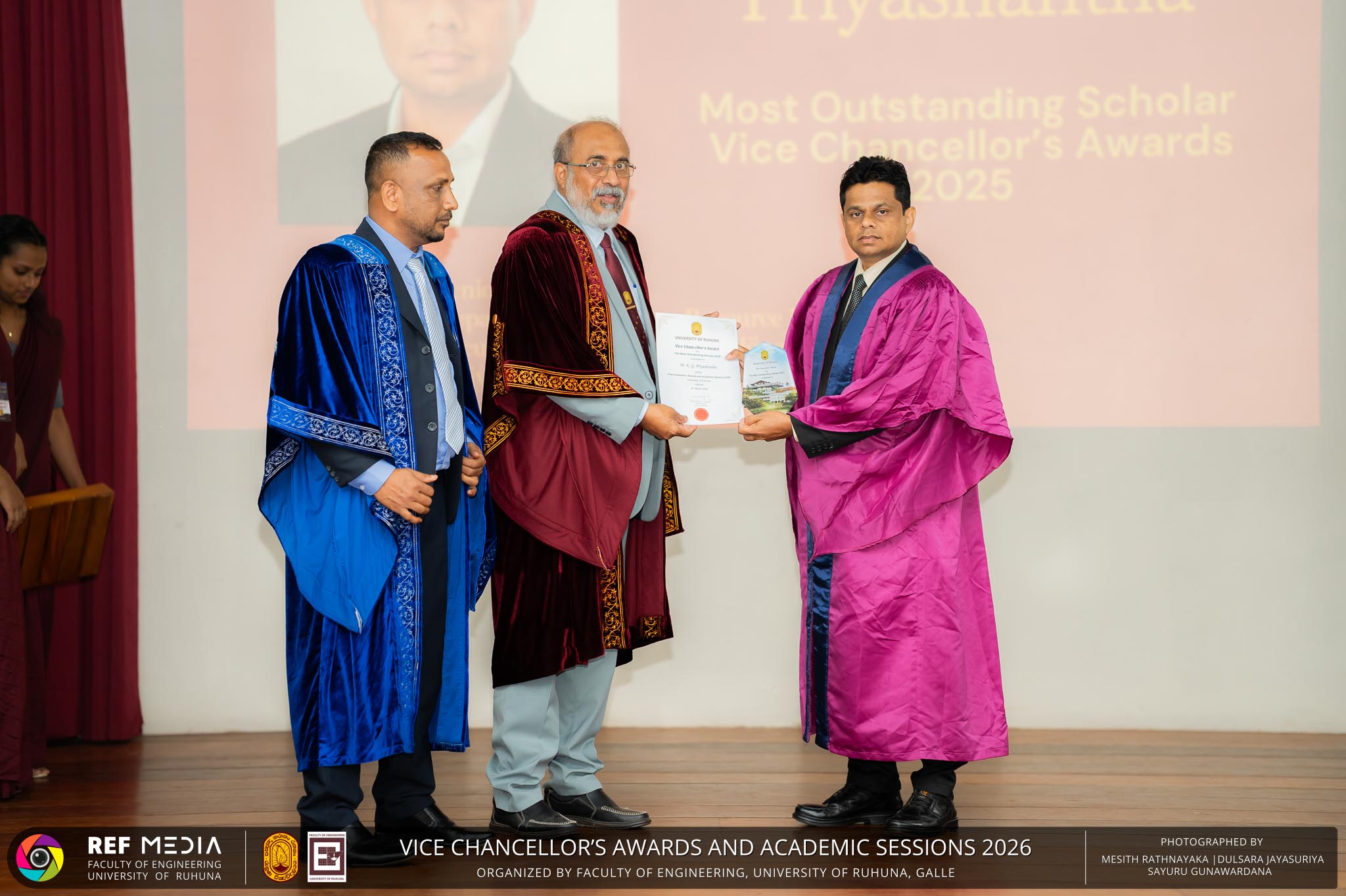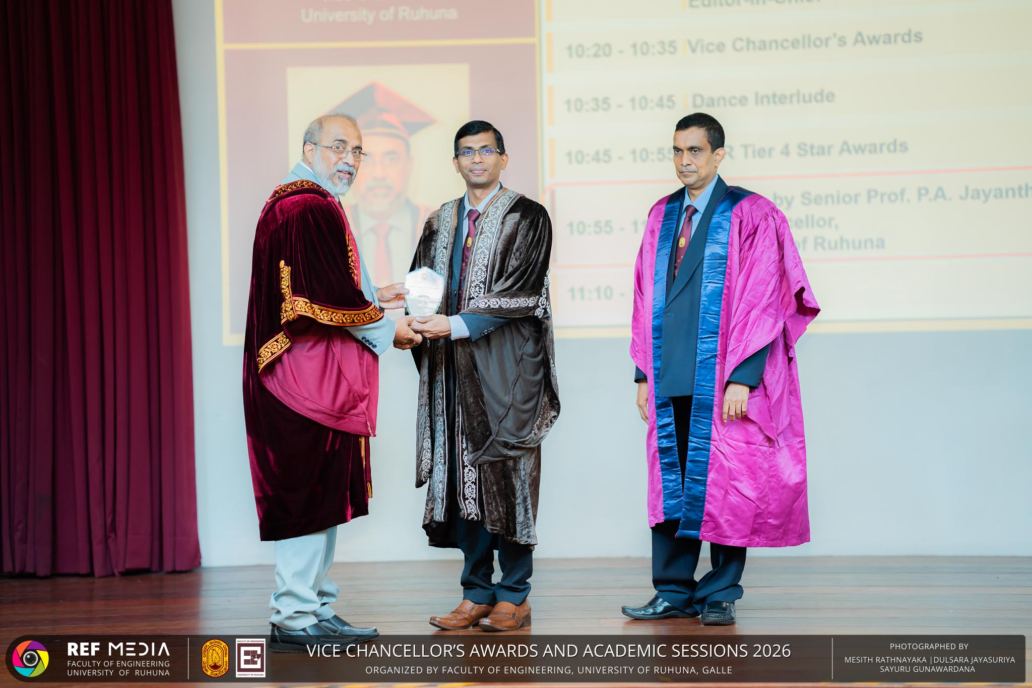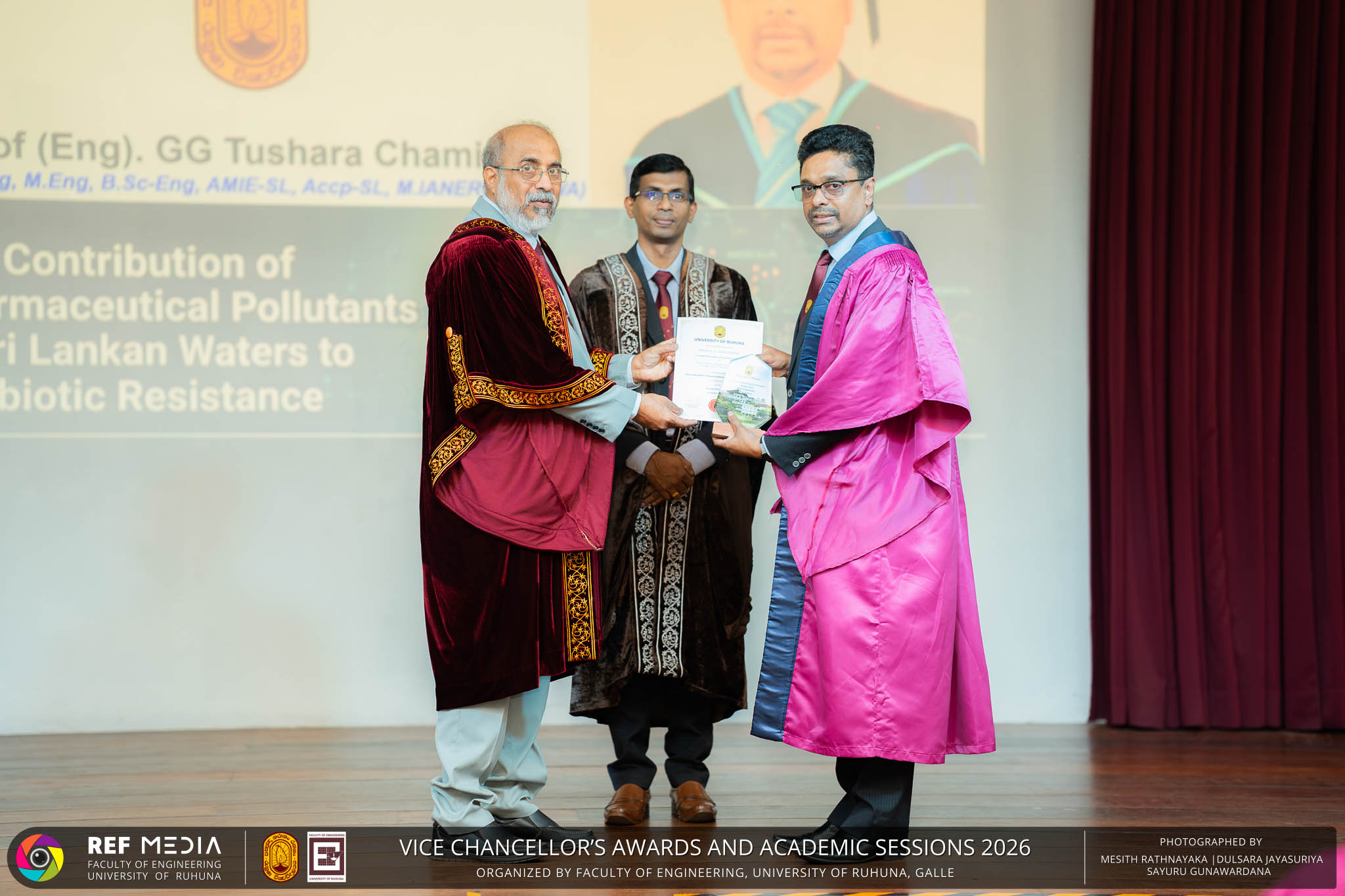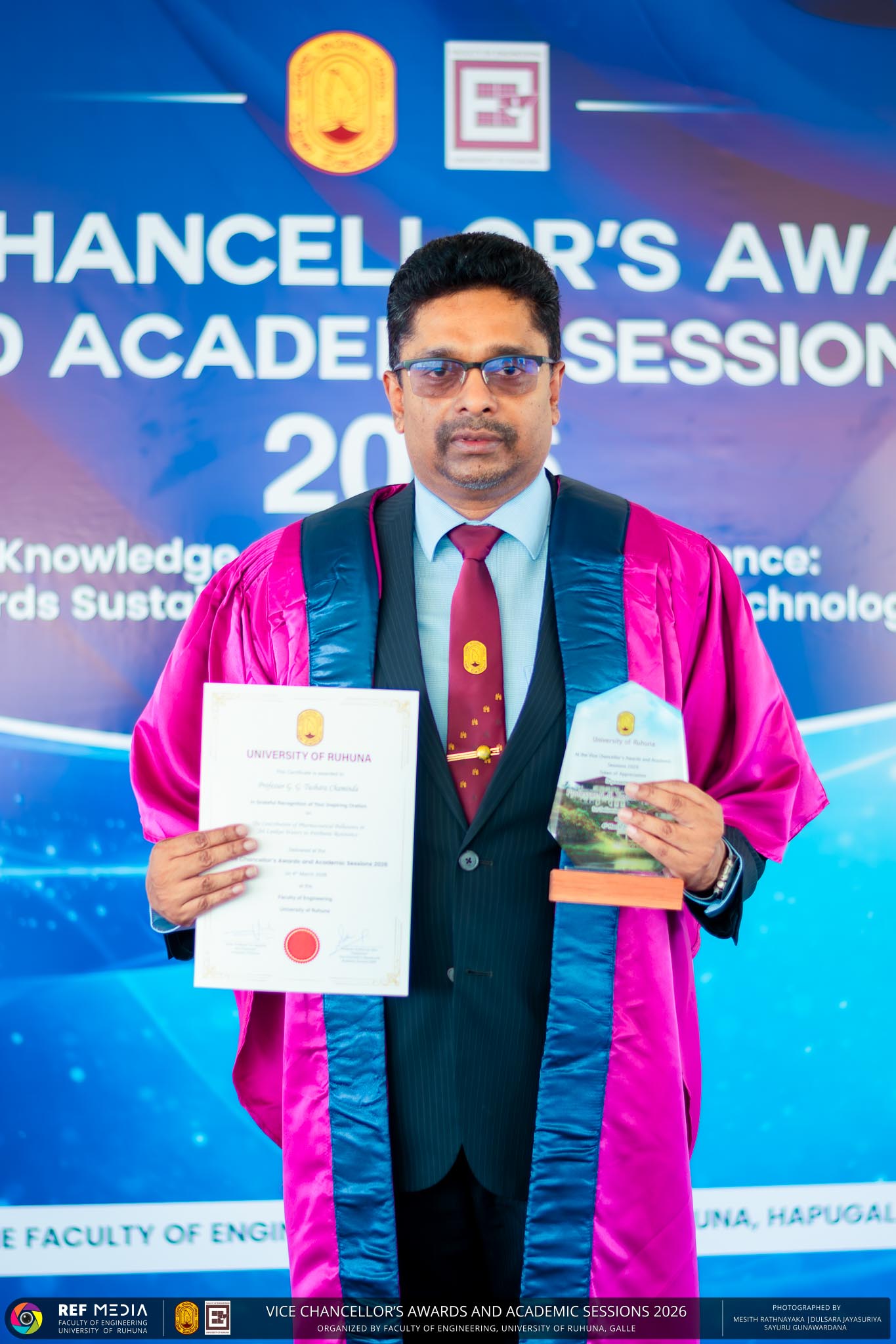 The Vice Chancellor’s Awards and Academic Sessions 2026 of the University of Ruhuna was successfully held on 4th March 2026 at the Faculty of Engineering, Hapugala, Galle, under the theme “Knowledge, Innovation, and Resilience: Towards Sustainable Futures through Technology”. The event served as an important platform for recognizing academic excellence, research achievements, and scholarly contributions across the University. The occasion was graced by Senior Professor P. A. Jayantha, Vice Chancellor of the University of Ruhuna, whose presence highlighted the significance of celebrating research excellence and academic accomplishments within the university community. The keynote address, titled “Research in the Era of AI and Advanced Technologies,” was delivered by Senior Professor Ruwan Gopura from the Faculty of Engineering, University of Moratuwa. The keynote provided valuable insights into emerging research directions and the impact of advanced technologies and artificial intelligence on contemporary research. A significant highlight of the occasion was the conferment of the Emeritus Professorship on Senior Professor (Ms.) K. A. P. W. Jayatilaka from the Faculty of Medicine, recognizing her distinguished academic service and contributions to the University. The Oration was delivered by Professor G. G. Tushara Chaminda on the topic “The Contribution of Pharmaceutical Pollutants in Sri Lankan Waters to Antibiotic Resistance.” The presentation highlighted the environmental presence of pharmaceutical residues in water bodies and their potential role in promoting antibiotic-resistant microorganisms. The Oration emphasized the importance of effective waste management, environmental monitoring, and research to address this emerging public health concern. It also drew attention to the relevance of this issue within the Sri Lankan context. During the event, Best Presenter Awards were presented to the recipients of the Academic Sessions 2025, covering both technical sessions and poster presentations in recognition of their outstanding research presentations. A highlight of the event was the presentation of the Vice Chancellor’s Awards, which recognize outstanding academic achievements within the University. Dr. K. G. Priyashantha from the Faculty of Management and Finance was honored as the Most Outstanding Scholar of the University, while Dr. K. L. Kushan Sudheera from the Faculty of Engineering received the award for the Most Outstanding Young Researcher. Furthermore, Professor Anoja P. Attanayaka from the Faculty of Medicine was recognized as the Most Outstanding Staff Inventor/Innovator. In recognition of exceptional research performance, the UOR Tier 4 Star Award was presented to Senior Professor Ajith Nagahawatta from the Faculty of Medicine and Senior Professor D. A. L. Leelamanie from the Faculty of Agriculture. The Academic Sessions provided a platform for researchers, academic staff, and postgraduate students to present their research findings through technical and poster sessions covering a wide range of disciplines. The event facilitated knowledge sharing, interdisciplinary engagement, and the dissemination of new research findings within the university community. A total of 123 abstracts were accepted for presentation, while 05 submissions were desk rejected and 07 abstracts were withdrawn due to unavoidable reasons (refer to Tables 1 and 3). Faculty-wise submissions (refer to Table 2) indicated that the Faculty of Engineering contributed the highest proportion (39%), followed by the Faculty of Agriculture (16%), the Faculty of Technology (14%), and the Faculty of Allied Health Sciences (13%). Other faculties of the University also contributed to the academic sessions. In total, 10 technical sessions and 3 poster sessions were conducted under seven thematic areas, showcasing research presented by university staff as well as postgraduate and undergraduate students. The event programme also included two cultural dance performances presented by undergraduate students of the Faculty of Engineering, which added a vibrant cultural element to the proceedings. The programme was smoothly conducted with the support of a dedicated team of Masters of Ceremonies. The event attracted more than 400 participants, reflecting strong engagement from the university community. The event was organized under the leadership of Professor Sudhira De Silva, Chair of the Organizing Committee, with Dr. Kumudu Seneviratna serving as the Secretary. The successful conduct of the event was made possible through the collective efforts and support of academic, administrative, non-academic staff and students who contributed to its organization. Overall, the Vice Chancellor’s Awards and Academic Sessions – 2026 strengthened the research culture of the University of Ruhuna by recognizing scholarly excellence and providing a platform for academic engagement and collaboration.
