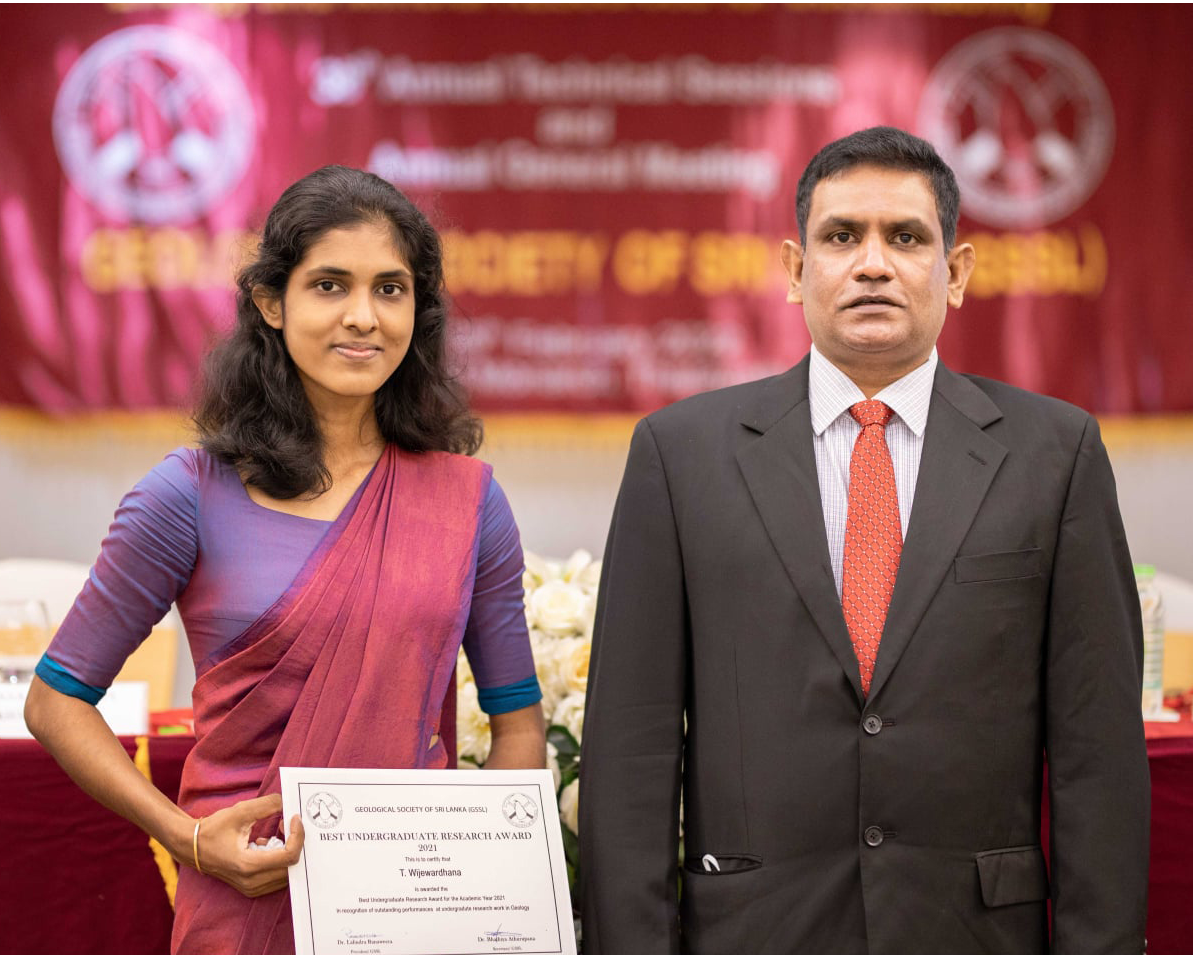 The award is presented by the Geological Society of Sri Lanka (GSSL) to a graduate who has completed the first degree at a state university of Sri Lanka, recognizing his/her outstanding research in the field of earth science. The award for 2021was presented at the 38th Annual Sessions of GSSL on February 25, 2022.